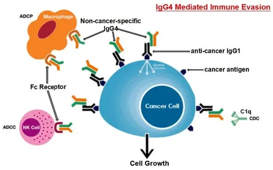 Diagram shows how IgG4 interferes with the body’s cancer inhibitors.