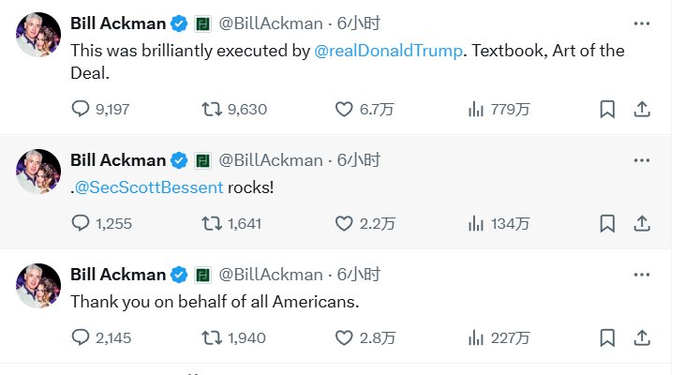 在这样的大涨中,自然有人感激涕零。比如,华尔街上最公开支持特朗普的对冲基金大佬、几天前还在力劝其暂缓“对等关税”的潘兴广场资本创始人阿克曼就在社交媒体平台X上对特朗普发帖称: